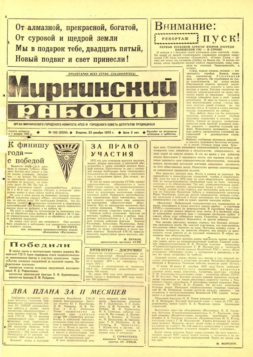 2️⃣1️⃣ декабря 1️⃣9️⃣7️⃣5️⃣ года в 17 часов 45 минут состоялся торжественный пуск в работу первого агрегата второй очереди Вилюйской ГЭС мощностью 85 МВт в п. #Чернышевский Мирнинского района Якутии. 💧 Приступая к её сооружению, строители и монтажники выдвинули встречный план: пустить первый агрегат ГЭС-2 ко Дню энергетика – 22 декабря 1975 г. – на год раньше, чем было предусмотрено программой. Слово свое гидростроители сдержали! ✅Благодаря пуску второй очереди Вилюйской ГЭС была снята напряженность в энергоснабжении потребителей Западного района Якутии в зимний максимум 1975-1976 годов, а также увеличена надежность энергоснабжения действующих алмазодобывающих предприятий. 📝 Этому событию был посвящен подробный репортаж в районной газете "Мирнинский рабочий". Предлагаем вернуться в прошлое и изучить архивные страницы. 🏐 Присоединяйтесь|#КВГЭС #Якутскэнерго #РусГидро #Мирнинскийрайон