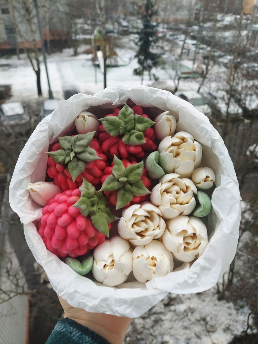 " Хотите почувствовать весеннее настроение прямо сейчас? Тогда эта уникальная композиция специально для вас! Что внутри: нежнейшие зефирные тюльпаны, словно привет из солнечного сада, и яркие ягодки малины, дарящие ощущение праздника и легкости. Поздравляйте с удовольствием! #зефирныекомпозиции #зефирцветымосква #зефирныебукетымосква #зефирныецветымосква #подарокзефирбутово