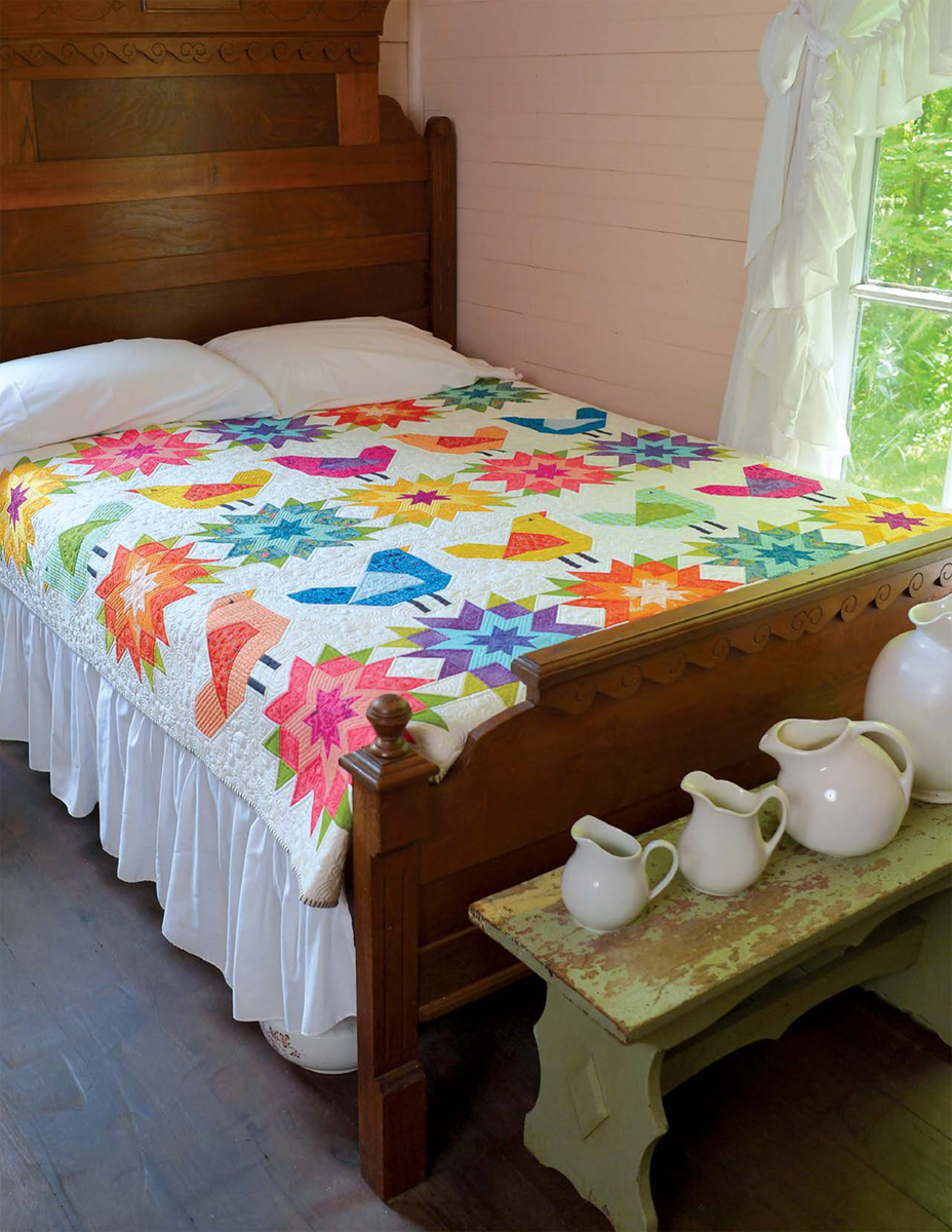 Дорогие рукодельницы, весна — это всегда радость! Сегодня делимся идеей большого уютного пледа с рядами милых птичек и пышных весенних цветов. Получается 15 блоков с птицами и 15 с цветами, собранных в полосы по пять штук и обрамлённых тонкой рамкой. Можно повторить предложенную раскладку или придумать свою — всё в ваших руках!