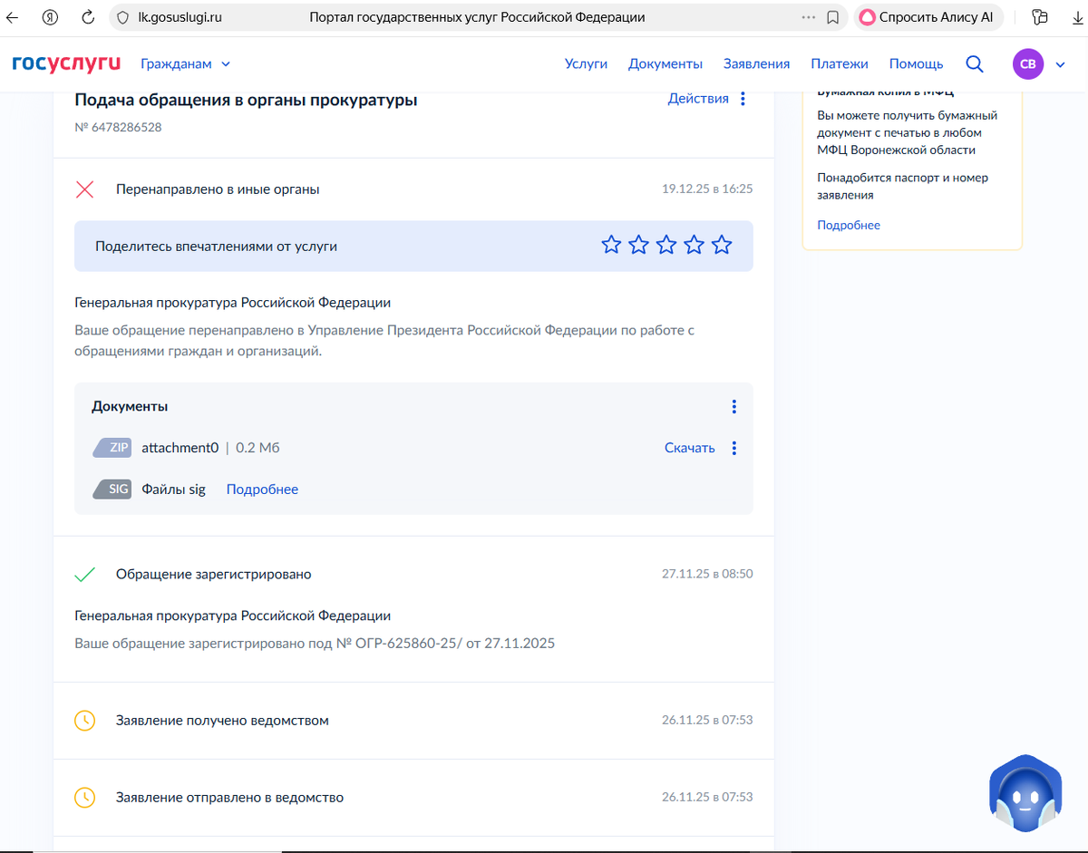 27 ноября 2025 года мною был получен ответ за №