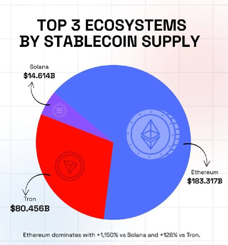 #Ethereum контролирует более 183 миллиардов долларов США в объеме предложения стейблкоинов, опережая #Tron на +128% и #Solana на колоссальные +1150%