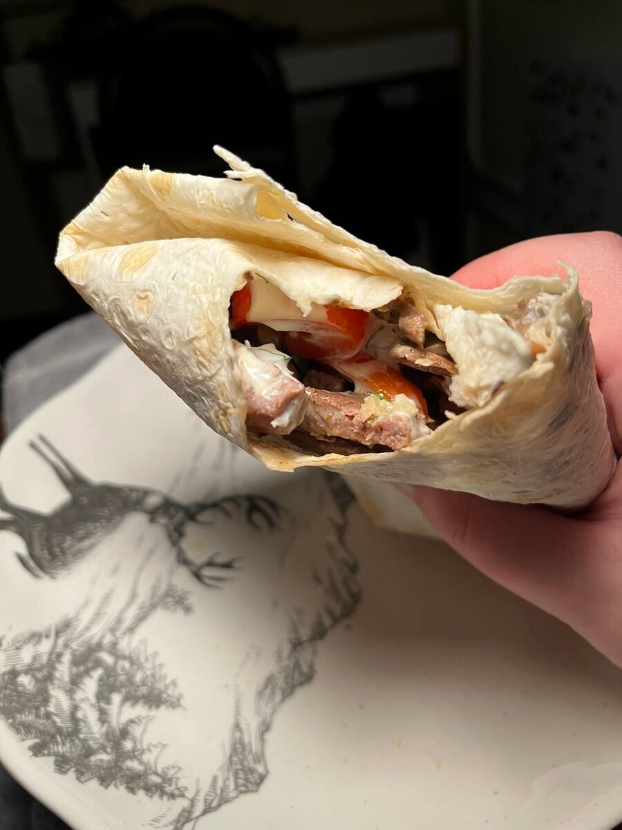 Нам понадобится: • 400 г говядины (тонкие полоски) • 1 болгарский перец • 150 г шампиньонов • ½ ялтинского лука • растительное масло для жарки • соль, перец по вкусу • 2 листа лаваша Для соуса: • 3 ст. л. сметаны • 1 зубчик чеснока • немного укропа Как готовить: • Разогрейте сковородку и выложите говядину. • Обжарьте без крышки до корочки, пусть чуть подрумянится. • Обжарьте болгарский перец и шампиньоны, накройте крышкой и готовьте до мягкости (желательно их жарить по-отдельности). • Для соуса смешайте сметану, чеснок и укроп. • На лаваш выложите мясо с овощами, сверху — соус, сверните и слегка обжарьте. Готово. Прекра