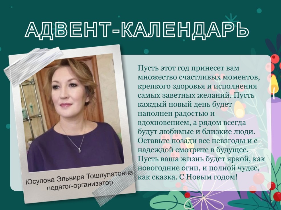 🎄 Педагог-организатор - человек, который всегда полон энергии, фантастических идей и креатива. Сегодня получаем такие же фантастически креативные поздравления от Юсуповой Эльвиры Тошпулатовны. А увидеть весь календарь можно по ссылке: https://vk.com/album-206909974_307859010 #ДОНМ #ШколыКолледжиМосквы