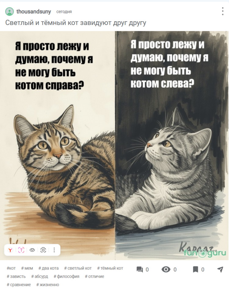 Знакомо чувство, когда кажется, что у других — всё лучше? Даже если на самом деле всё примерно одинаково. Мы смотрим на чужую жизнь, работу, внешность и ловим себя на мысли: «Вот бы мне тоже так!» А что, если этот «другой» в тот же самый момент смотрит на вас и думает ровно то же самое? 😅 Этот вечный цикл зависти и саморефлексии лег в основу нового мема, который мы создали не в одиночку, а в коллаборации с искусственным интеллектом. Идею абсурдного диалога двух котов, которые завидуют друг другу просто из-за цвета шерсти, подсказал GigaChat. А визуальную жизнь в эту идею вдохнула нейросеть Leonardo.AI, создав фотореалистичный и очень выразительный кадр. Получился не просто смешной рисунок, а маленькая философская притча в формате, который понятен каждому, кто хотя бы раз заходил в интернет. Но у мемов, как и у любых творений, есть своя судьба. И сейчас его судьба решается на популярной платформе развлекательного контента fun.guru. Именно там он борется за внимание, лайки и шанс стать