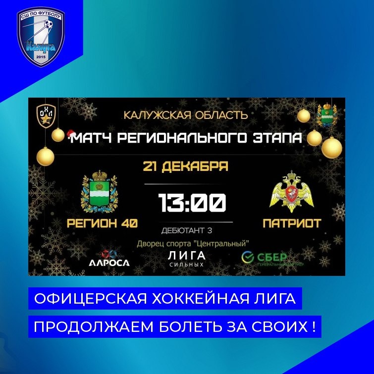 ! 🏒В воскресенье, 21 декабря, в Дворце спорта "Центральный" на льду сойдутся команды госслужащих "Регион40" и Росгвардии "Патриот". Начало в 13.00. ВХОД СВОБОДНЫЙ 🎉Приглашаем всех! Приходите поддержать своих родных, близких, коллеги и друзей! #спортнормажизни #калужскаяобласть #калуга #министерствоспортакалужскойобласти