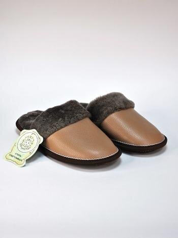 Тапочки кожаные с опушкой Бежевые (артикул: 176