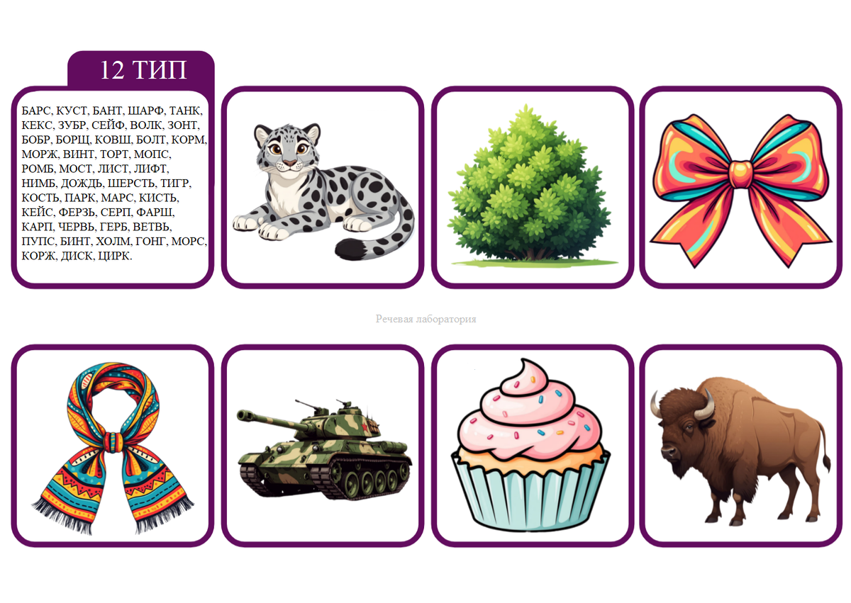 Ниже представлена подборка слов 12 типа слоговой структуры в картинках.