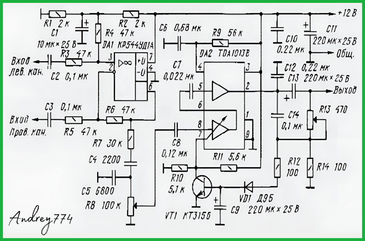 Я начал искать схемы, способные воссоздать похожий эффект. В библиотеке мне попался журнал "Радио" за 1999 год. Не помню названия статьи, но её суть сводилась к созданию пространственного канала. Я зарисовал предложенную схему, собрал её и подключил к ламповому усилителю.