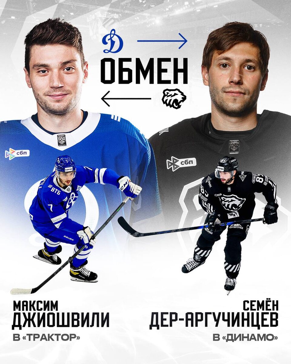 Челябинский «Трактор» и московское «Динамо» совершили сделку, обменявшись форвардами. В столицу переезжает Семен Дер-Аргучинцев, а Максим Джиошвили продолжит карьеру за южноуральский клуб. Информацию об обмене нападающими подтвердили в штабе двух хоккейных команд. В чемпионате КХЛ сезона-2025/26 форвард «Трактора» Семен Дер-Аргучинцев провел 33 матча и набрал 23 (2 + 21) очка. На счету Максима Джиошвили 36 игр за «Динамо», в которых он набрал 9 (3 + 6) баллов. Отметим, что форвард «бело-голубых» в прошлом сезоне завоевал бронзовые медали с московским «Динамо», отметившись в розыгрыше Кубка Гагарина 9 (5 + 4) баллами в 17 встречах и побив личный рекорд по набранным очкам за сезон (16 голов и 17 передач). «Обмен с „Динамо“ несет в себе несколько задач. Оба хоккеиста прошли свой пик в нынешних клубах и нуждаются в смене обстановки, поэтому для каждой стороны трансфер пойдет на пользу. Максим Джиошвили — один из лучших нападающих КХЛ с акцентом на оборонительные функции и стабильной игрой