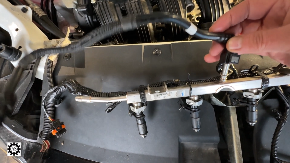 - Аккуратно отсоедините разъем топливной трубки от рампы (будьте готовы к небольшому проливу бензина, подложите ветошь).