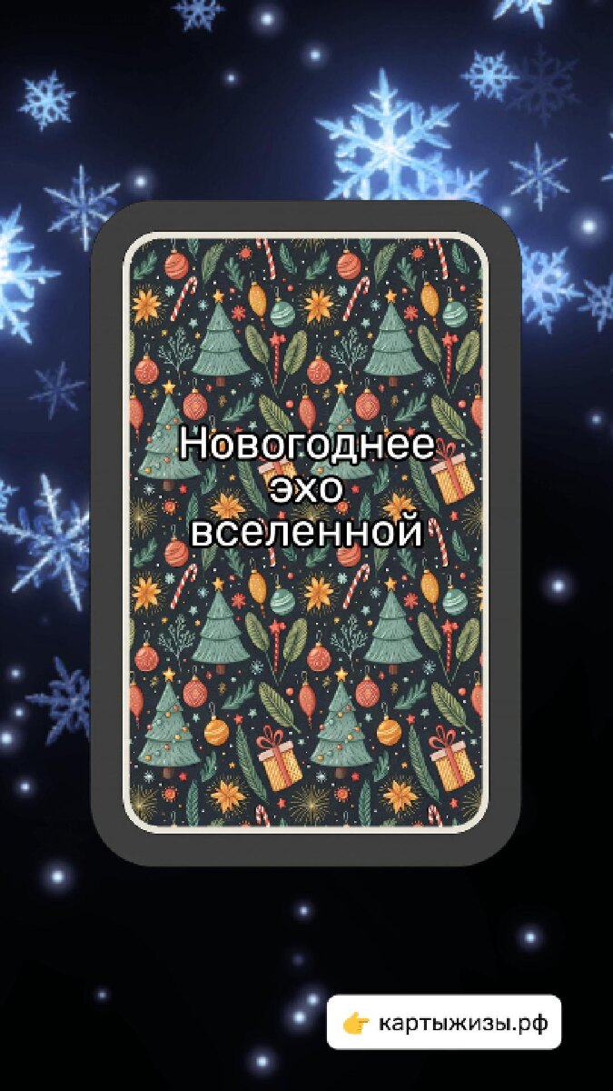 «Новогоднее Таро» — колода о мандаринах, тёплом свете и тех маленьких чудесах, которые случаютcя между салатом и фейерверком. Разрешите себе светить тихо. Не ослеплять, не вдохновлять, не зажигать толпы. Маленькая искра — это уже свет. И этого более чем достаточно. 🌟 Прямое: у вас осталась своя искра — даже если вокруг тускло. ✨ Перевёрнутое: ждали вдохновения, а оно не пришло — бенгальский погас. 🎁 Идея / напутствие: купите набор бенгальских огней или маленькую свечу и помните: вы сами — уже чудо. Все карты — на картыжизы.рф 🎄 #знакивселенной #картадня #картыжизы #новогоднеетаро