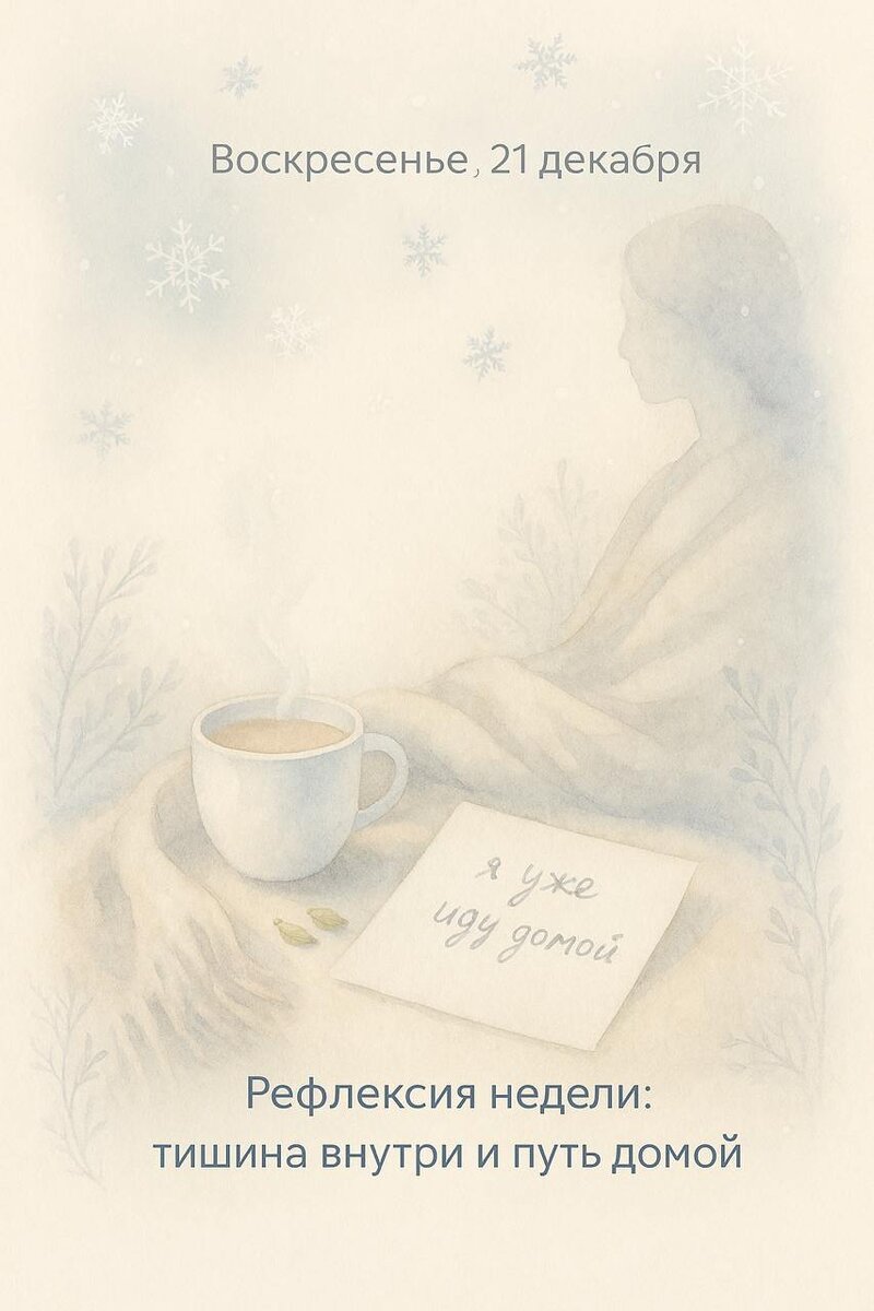 Самое длинное прикосновение к себе. Зимнее солнцестояние — не просто про свет. Это про внутренний поворот: от внешнего — к корневому. 🌀 Что происходило на неделе. Капха нарастает: тело тянет ко сну, душа ищет уюта, но ум всё ещё хочет «успеть». Неделя могла быть вязкой, но не пустой. То, что кажется «ничего не происходит» — на самом деле глубокая перенастройка. 🌾 3 вещи, которые могли сработать: ✔ Завтрак с тёплым гхи ✔ Прикосновение: стопы, ладони, масло ✔ Снижение «шумов» — меньше экранов, больше тишины 🌱 1, которую пробуем завтра: Спросить себя утром: где я хочу быть к вечеру — не в задачах, а в ощущениях? И построить день от этого чувства. 📓 Рефлексия для записи вечером: 1. Что я сохранила в теле на этой неделе? 2. Где я почувствовала мягкость? 3. Что я могу отпустить вместе с этим солнцем? 🚫 Чего не делать: Не дави на себя. Сегодня не день для рывков. Сегодня — день для корней. 👁 Образ: Чашка с молоком и кардамоном. Плед. Лист бумаги с тремя словами: я уже иду домой.