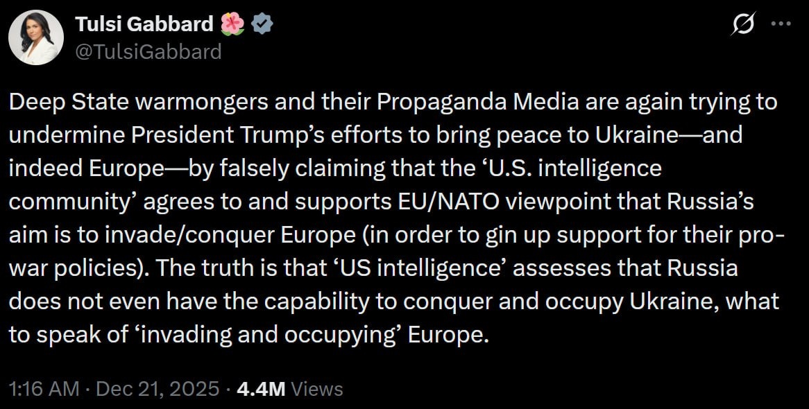 Директор Национальной разведки США Тулси Габбард. Разжигатели войны из «глубинного государства» и их пропагандистские СМИ вновь пытаются подорвать усилия президента Трампа по установлению мира на Украине — и, по сути, в Европе. Они ложно утверждают, что «разведывательное сообщество США» якобы согласно и поддерживает точку зрения ЕС/НАТО, согласно которой цель России — вторгнуться/захватить Европу (чтобы заручиться поддержкой своей провоенной политики). Правда же заключается в том, что, по оценкам «американской разведки», у России нет потенциала даже для захвата и оккупации Украины, не говоря уже о «вторжении и оккупации» Европы. Вчера издание Reuters опубликовало материал со ссылкой на шесть источников, знакомых с разведданными. В статье говорится, что американская разведка видит в поведении президента России Владимира Путина желание «захватить всю Украину» и сделать европейскую часть бывшего СССР российской территорией. Соответствующие предупреждения, как говорят собеседники Reuter