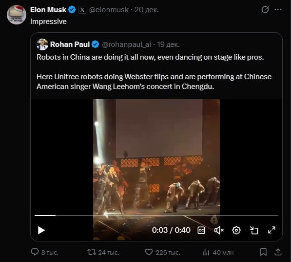На концерте китайского поп-исполнителя Вана Лихуна вместе с артистами выступили гуманоидные роботы Unitree G1. Роботы синхронно исполняли хореографию на одной сцене с танцорами, а кульминацией номера стало одновременное сальто в финале выступления. Видео быстро разошлось по соцсетям. Завирусившийся ролик прокомментировал американский предприниматель Илон Маск, назвав выступление "потрясающим". Гуманоидные роботы разработаны компанией Unitree Robotics, стоимость одного устройства - около 13,5 тысяч долларов. #ruoxuaz #роботыUnitreeG1 #ВанЛихун #ИлонМаск ✈️ Новости Азербайджана 🔗 Написать нам