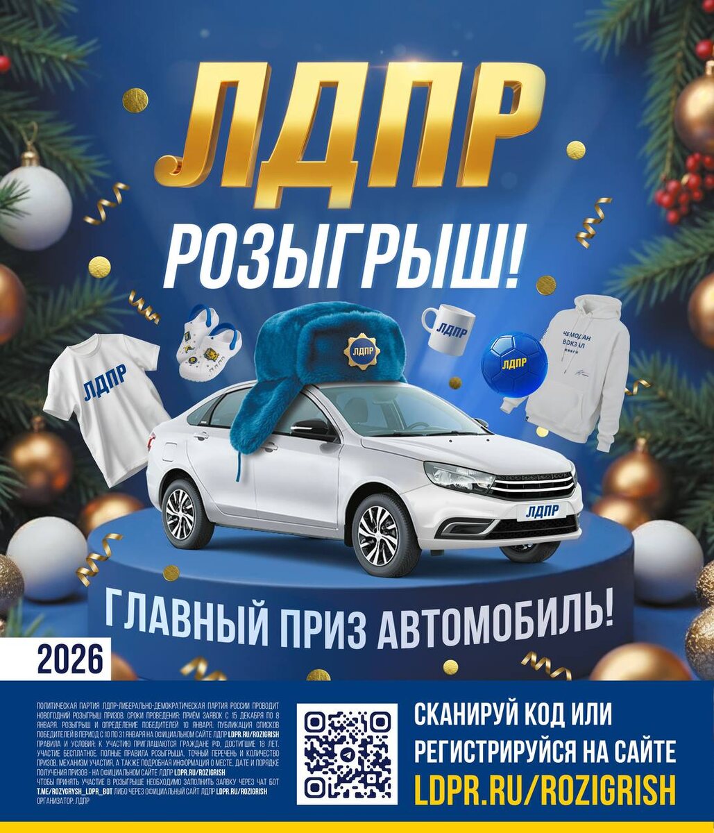 🎉 Хотите начать 2026 год с подарков? ЛДПР запускает большой новогодний розыгрыш, где главный приз — автомобиль 🚗 🎁 Также разыгрываем брендированные подарки ЛДПР. Участвовать просто: 🔹 отсканируйте QR-код 🔹 зарегистрируйтесь по ссылке @Rozygrysh_LDPR_bot или на сайте 👉🏼 LDPR.RU/ROZIGRISH 📅 Заявки принимаем с 15 декабря по 8 января 🏆 Победителей определим 10 января 📢 Списки опубликуем на официальном сайте ЛДПР Участвовать могут все граждане России старше 18 лет. ☝🏼Не откладывайте, участвуйте сами и зовите друзей!