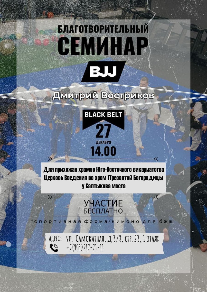 Приглашаем на бесплатный благотворительный семинар по бразильскому джиу-джитсу и грэпплингу. Мероприятие проводит Востриков Дмитрий Георгиевич - 6-ти кратный Чемпион Мира по бразильскому джиу-джитсу, многократный призер и чемпион международных турниров, главный тренер Международной академии Grappling Fight Team в России, основатель Российской академии Grappling Fight Team. Тренер, воспитавший 27 Чемпионов Мира и более 60 Чемпионов Европы. Дата и время: 27 декабря в 14:00 Адрес: Самокатная 3/8 с.23, 1 этаж - спортивный зал на территории Троицкого и Введенского храмов у Салтыкова моста. При себе обязательно иметь спортивную форму. Без возрастных ограничений!!! Дополнительная информация по телефону 89092177111 За приглашение спасибо подписчику канала Александру ( Александр ). Подписывайтесь на канал "Движуха в Марьино"!