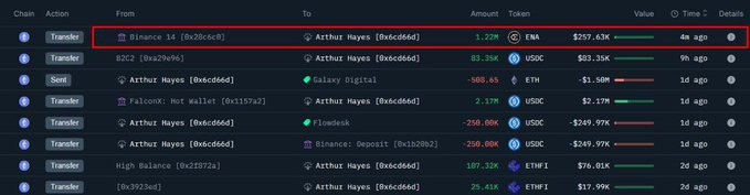 🔸Артур Хейс вывел 1,22 млн ENA ($257,63 тыс) с Binance.