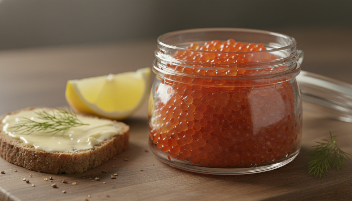 - Хозяин подходит к столу с деревянной доской: банка с копчёной икрой, мини‑тосты, лимон, укроп.