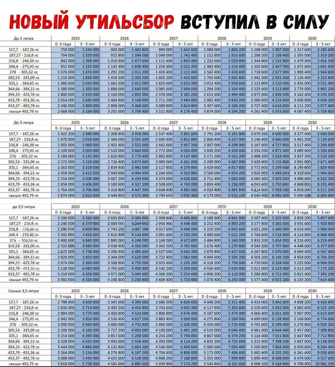 лошадиных сил. Это повышение коснется всех машин данной категории, включая востребованные в стране модели Kia, Hyundai, Toyota, BMW, Mercedes, а также множество китайских брендов. Примеры дополнительных платежей (вместо прежних 3,4 тыс. рублей): Kia K5 — от 795 тыс. рублей; Toyota Camry 3,5 — от 2,9 млн рублей; Lixiang L9 — почти 2 млн рублей; BMW M5 — от 4 млн рублей; Дальше — больше: с 1 января 2026 года утильсбор увеличится еще на 25%, а затем ежегодно на 10–20%. К 2030 году по некоторым моделям он может превысить 10 млн рублей. По словам Минпромторга, эти изменения не повлияют на 80% жителей России 🤡 Вот как прокоментировать слова Минпромторга?)