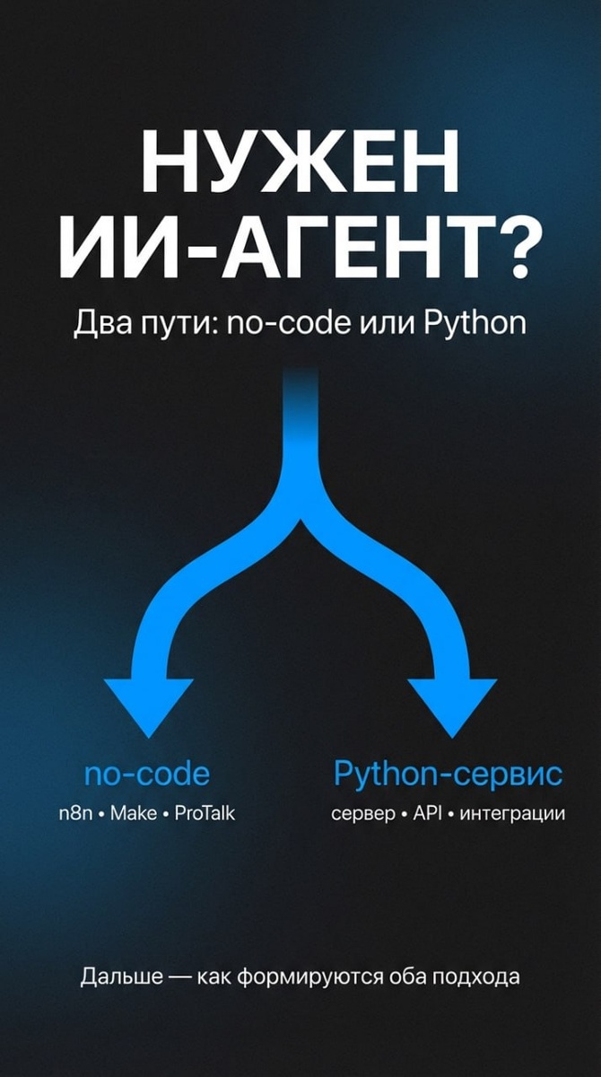 : "Нужен ИИ-агент". И дальше начинается главный момент: одно и то же "нужен ИИ-агент" можно реализовать по-разному, и от выбора подхода зависит срок, бюджет и то, придётся ли потом всё переделывать. Чтобы было понятнее, приведу два примера задач. Мои сервисы - @ClientVoiceBot и @neurostudio_ai_bot - написаны на Python и работают на сервере. - Контроль диалогов - когда нужно превращать звонки/переписки в понятные выводы и задачи: что было сказано, где просели, что улучшить, кому что сделать. - Нейростудия - когда нужно быстро получать изображения под конкретные бизнес-задачи: обложки, креативы, карточки, иллюстрации. Снаружи это выглядит одинаково: "сделайте". А внутри обычно есть развилка. 1) Готовые платформы (no-code) Это когда ИИ-агент собирается из готовых блоков: шаги, кнопки, формы, сообщения, таблицы, простые условия. Примеры: n8n, Make, ProTalk. Сильная сторона: быстро стартовать и проверить сценарий на реальных пользователях. Слабая сторона: если появляется много нестанд