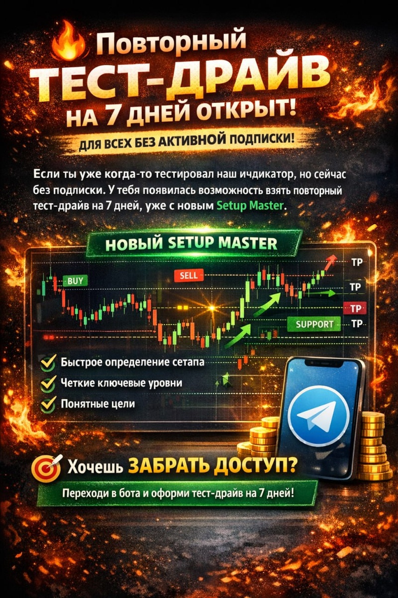 Если ты уже когда-то тестировал наш индикатор, но сейчас без подписки, то это финальный шанс забрать повторный тест-драйв на 7 дней уже с новым Setup Master. Это как раз тот апдейт, который помогает быстрее собирать сетап, видеть ключевые уровни и цели и меньше заниматься гаданием в стиле “что тут вообще происходит и почему рынок опять издевается”. ⏳ С завтрашнего дня выдача повторного тест-драйва закрывается. 🎯 Хочешь забрать доступ? Переходи в бота и оформи тест-драйв на 7 дней.