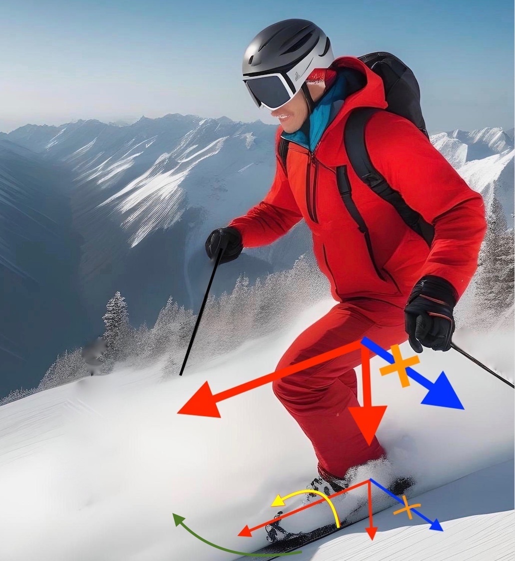 Как кататься на горных лыжах. Метод 3 движений <<--Урок 5 Урок 7-->> ⛷ Записаться на тренировку на Красной Поляне Руление - это поворачивание лыж в положение под углом к направлению движения лыжника (любители иностранных терминов называют это "бракаж", от французского braquage). Руление осуществляют шагом (Урок 2) или прыжком (Урок 3). Подрулив лыжи, их ставят на канты. В таком положении они соскальзывают; сначала только мысками и пятками, а затем по всей длиной кантов. И тогда (и только тогда) лыжи поедут по дуге. Без руления невозможно войти в следующий поворот даже на карвинговых лыжах (Урок 4). Чтобы начать поворот недостаточно повернуть лыжи с одного канта на другой (желтая стрелка на рисунке), нужно их ещё и прогнуть. Если лыжи не подрулить поперек движения (зеленая стрелка), то силы для их прогиба (синие стрелки) не возникнут: Лыжник движется под действием следующих сил (красные стрелки): Если лыжи не подрулить, для прогиба потребуются силы (синие стрелки) действующие вверх