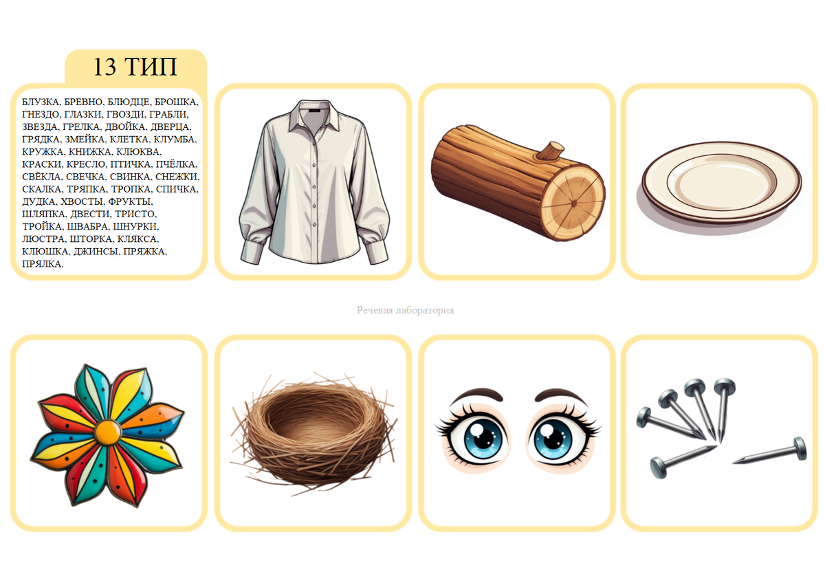 13-й тип слоговой структуры по классификации А. К. Марковой — это двухсложные слова с двумя стечениями согласных (кнопка, пряжка, скалка и т.д.) Ниже представлена подборка слов 10 типа слоговой структуры в картинках.