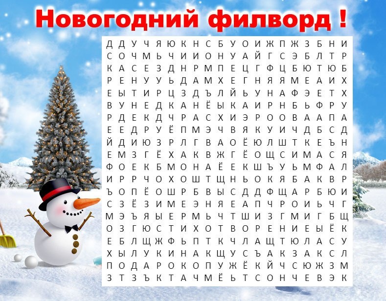 ! ✨ Новогодние праздники — время чуда, тепла и радостных воспоминаний! 🎄 В честь наступающего Нового года предлагаем вам разгадать праздничный филворд! 🎁 Вам нужно найти слова, связанные с Новым годом или вызывающие новогодние ассоциации: ёлка, Дед Мороз, снег, подарки и многое другое! ❄️ Слова могут располагаться: → слева направо и справа налево, → сверху вниз и снизу вверх, → а также по диагонали! Удачи! 🎉 А найденные слова не забудьте написать в комментариях — посмотрим, кто самый внимательный! 😊