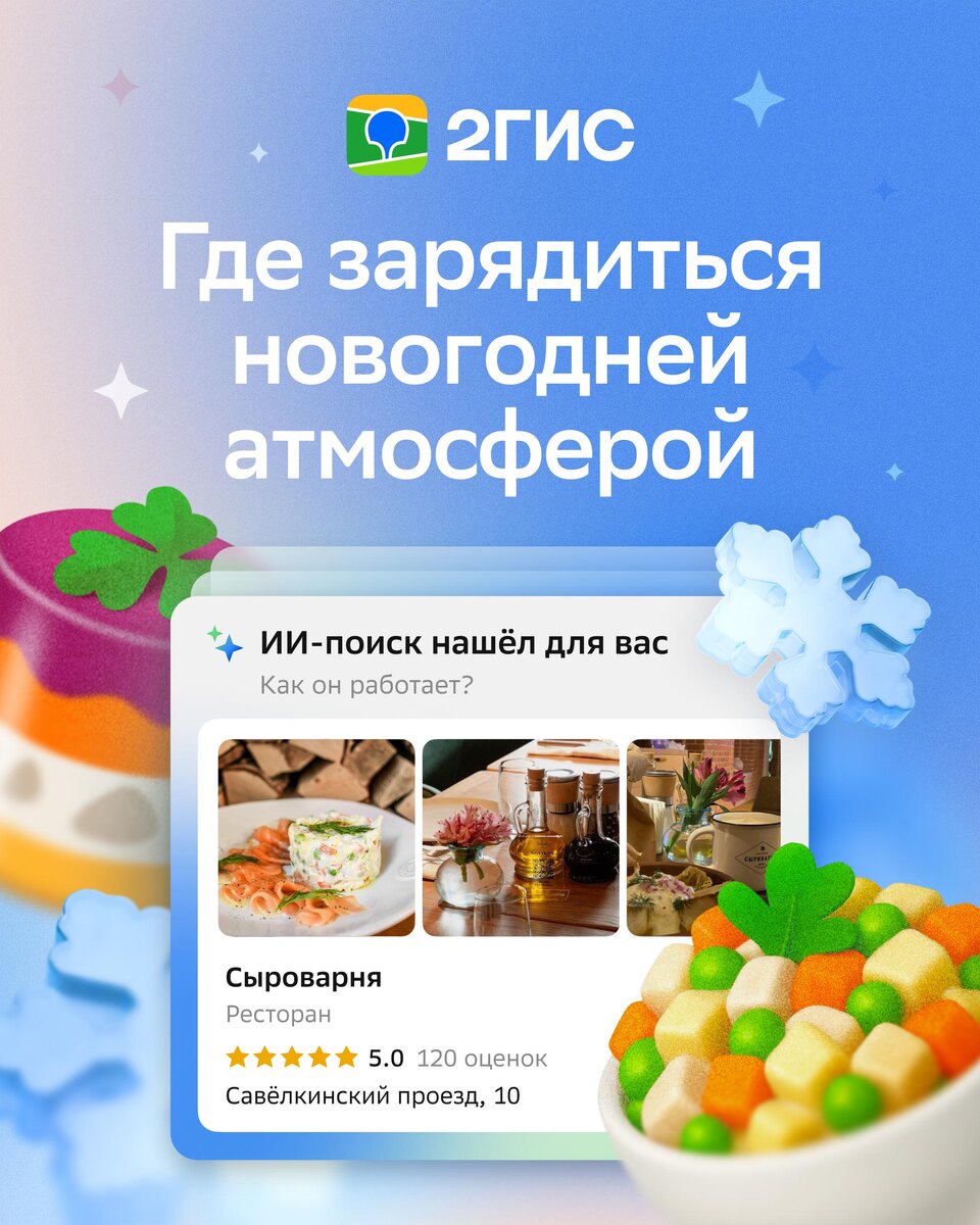? В 2ГИС можно просто спросить так, как вы думаете. ИИ‑поиск подскажет кафе и рестораны, где уже чувствуется приближение праздника: тёплый свет гирлянд, уютный интерьер, сезонное меню и горячий шоколад. Попробуйте найти: ➡️ облепиховый чай ➡️ безалкогольный глинтвейн ➡️ где зарядиться новогодней атмосферой ИИ‑поиск в разделе «Поесть» поймёт и подскажет, куда идти. Пишите как хотите и получайте подходящие места поблизости 💚