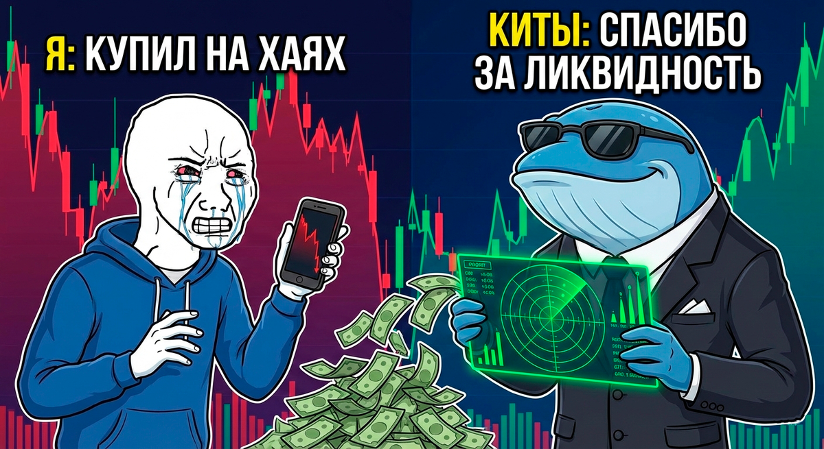 Для крупного игрока (кита, маркетмейкера) вы не трейдер. Вы — источник ликвидности. Чтобы он смог купить много и дешево, вы должны в панике продать. Чтобы он смог зафиксировать прибыль, вы должны на эйфории купить у него на самой вершине.