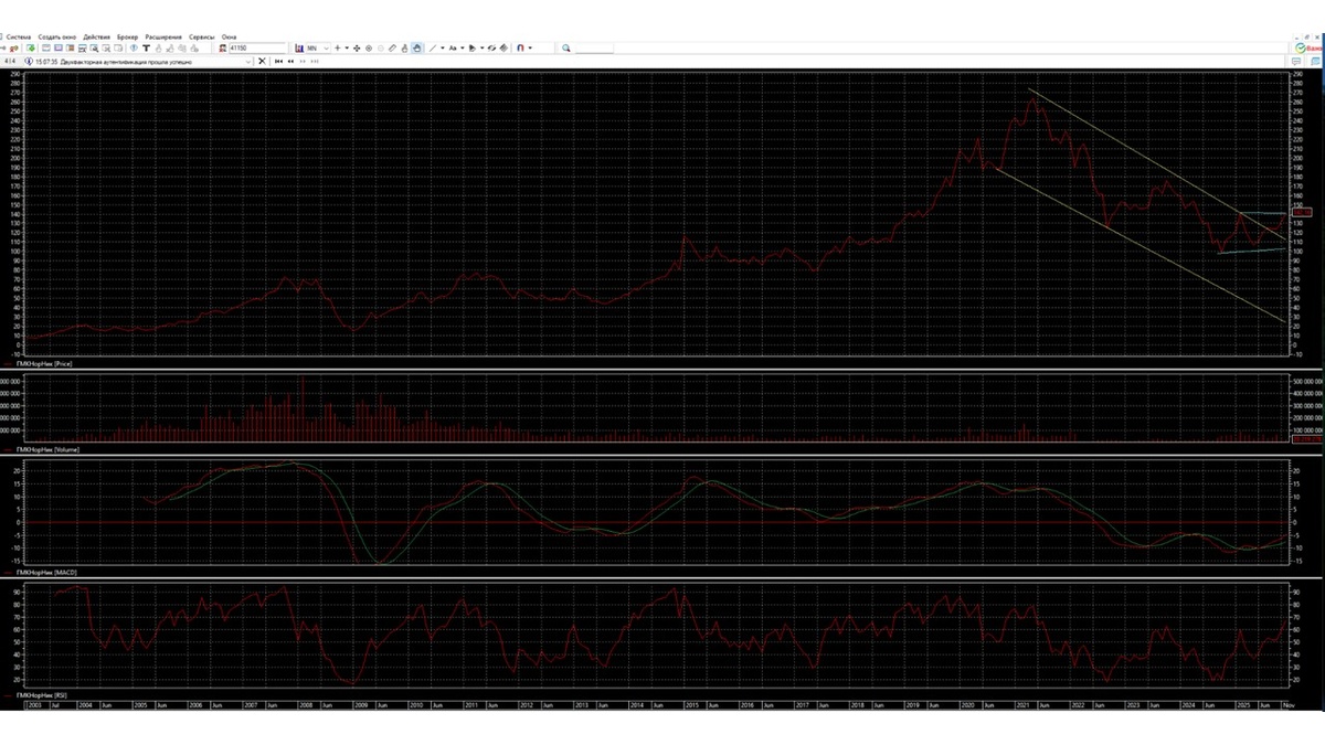 Месячный график показывает, что акция ГМКНорНик сохраняет настроение для движения наверх. Скорее всего данное движение находится на завершающем этапе и это движение не сможет пройти уровень 150. Индикатор RSI снизу подошел к уровню 70% с попыткой пойти дальше наверх, скорее всего скоро увидим разворот вниз. Индикатор MACD располагается под нулевым уровнем и стремится выйти на него, чтобы закрепиться. Объем торгов показывает минимальное количество инвесторов в акции, их активность постепенно понижается.