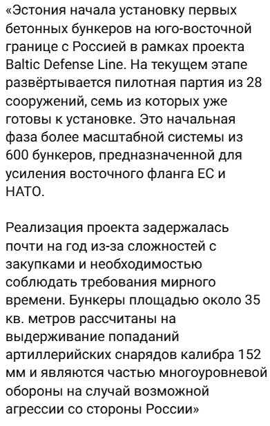 Или не спасут. Я не знаю. чего больше в этой новости, глупости, наивности, желания заработать. Просто заработать можно, если есть спрос, а он , судя по всему , присутствует. У меня несколько вопросов. Первый. Сколько эстонцев предполагается спасти и как будет происходить отбор. Демократическим путём, путём проведения национальной лотереи, путём сдачи тестов на соответствие европейским ценностям или тупо за деньги. Второй. Почему они решили спасаться от 152 мм калибра? Вот правда, почему 152? Им информацию кто предоставляет? И как быть с остальным калибром? У нас что, договорённости подписаны, что конкретно против Эстонии мы будем использовать именно эту ? А как же наши ФАБы? Не говоря уже об остальном. Третий. Усиление восточного фланга бункерами это случайно не ноу-хау в военном искусстве? Больше напоминает на заранее купленные кусочки земли на европейском кладбище. Четвёртый. Кто бенефициар этого проекта? Откуда ноги растут и куда финансы аккумулироваться будут? Пятый. А когда насел