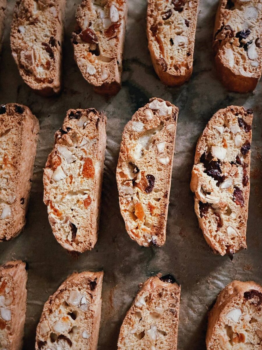 Если вы еще не пекли это печенье — советуем. Ловите рецепт бискотти, итальянского лакомства, которое так любят готовить накануне Нового года и Рождества 🤩🤩 Ингредиенты: 220 г муки 2 яйца 100 г сахара 40 г сливочного масла 100 г сухофруктов (изюм, вяленая клюква, курага и др.) 100 г орехов (миндаль, фундук, грецкий орех и др.) ½ чл слои 1 чл разрыхлителя цедра 1 апельсина половинка бадьяна 1. Сухофрукты должны быть примерно одного размера, если используете курагу или чернослив, нарежьте его. Залейте все сухофрукты кипятком минут на 10-15. Слейте воду, промокните все сухим бумажным полотенцем. 2. Орехи порубите ножом на крупные кусочки. 3. Растопите сливочное масло. 4. Соедините все ингредиенты. Чтобы тесто собралось в комок, можно добавить немного воды. *Если тесто будет прилипать к рукам, можно отправить его в холодильник на полчаса. 5. Разделите тесто пополам и сформируйте две невысокие прямоугольные формы. 6. Разогрейте духовку до 180 градусов. 7. Выпекайте бискотти около