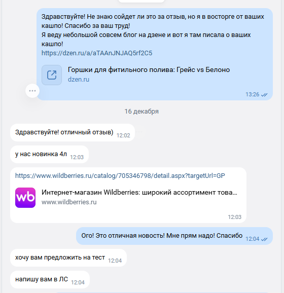 Недавно я написала сравнительный обзор кашпо Grace и Belono — просто потому, что мне интересна тема фитильного полива. Особенно когда кашпо не только удобные, но и красиво выглядят — для меня это огромный плюс. Я рассказала про плюсы и минусы на мой взгляд в быту. Не претендую на гуру фитильного полива, но этот вариант мне нравится, и я его активно использую. Подумала, что моё мнение может быть полезно читателям. Немного осмелев, решила отправить эту статью как отзыв в официальную группу Belono. Ничего не ожидала взамен — просто захотелось поделиться. В современном мире отзывы чаще пишут, когда что-то негативное, а положительные — реже. Хотела, чтобы людям из бренда было приятно. На следующий день — сообщение от основателя! Я прыгала до потолка — это мало сказать. Сердечко замерло, забыла, как дышать. Я в личной переписке с основателем бренда! Сказала, что у меня крошечный блог, не особо много опыта, не гуру растений. А мне ответили: "Ничего страшного, нам интересно мнение разных людей