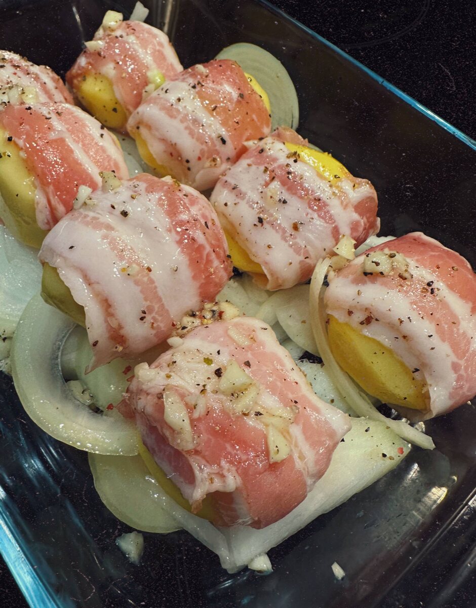 Философия блюда: Аппетитные «бочонки» с хрустящей беконной рубашкой и нежной картофельной сердцевиной. Идеальная закуска к напиткам или сытный гарнир к мясу. Ингредиенты (на 10-12 порций): Основное: · Картофель (небольшой, ровный, овальный) — 10-12 шт. (размером с крупное куриное яйцо) · Бекон слайсами — 10-12 длинных полосок •Лук репчатый—1шт. · Растительное масло — 1 ст.л. · Соль, черный перец — по вкусу Для ароматной пропитки (обязательно!): · Чеснок — 2-3 зубчика (пропустить через пресс или мелко порубить) Для подачи: · Соус (сметанно-чесночный, сырный, «Барбекю») · Свежая зелень Пошаговый рецепт (с целой очищенной картошкой): Этап 1: Подготовка картофеля (важно для мягкой сердцевины). 1. Картофель очистите от кожуры. Выберите клубни максимально одинакового небольшого размера. 2. Отварите до полуготовности: Положите в холодную подсоленную воду, доведите до кипения. Варите 10-12 минут с момента закипания (вилка или нож должны входить с небольшим усилием, середина останется чуть тв