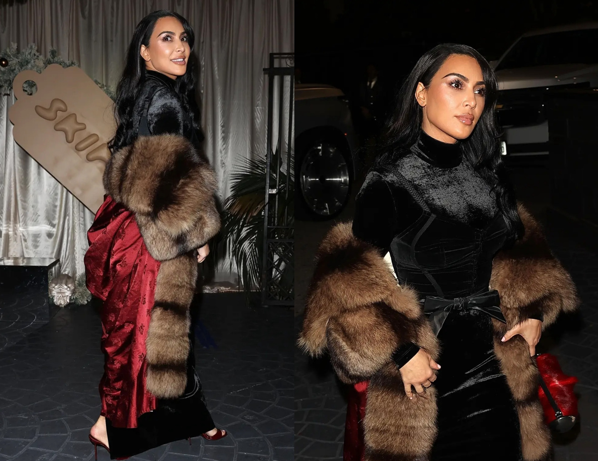 Если вдруг ваш корпоратив проходит в формате «по-Кардашьяновски», где всего должно быть слишком много — эмоций, блеска, внимания и разговоров на следующий день, у Ким Кардашьян есть наглядная инструкция. Без моралей и стилистических лекций. Один выход — и всё ясно. Для праздничной вечеринки Ким выбрала чёрное бархатное платье с бантом. Тот самый бант, который моментально превращает образ в аккуратно упакованный подарочек. Сдержанный силуэт, длинные рукава, высокий ворот — и при этом ни грамма скуки. Идеальный вариант для корпоратива, где нужно выглядеть эффектно, но так, чтобы никто не делал вид, что «не понял ваш месседж». Тема «я - подарок» читается без субтитров. Чёрный бархат - как дорогая коробка, бант - финальный акцент. Всё на месте, ничего лишнего. Осталось только помнить, что внутри. У Ким с этим, как известно, проблем не бывает. Сверху она накинула пальто из красного шёлка с меховой отделкой. Театрально, празднично и очень в духе «я зашла ненадолго, но запомнят меня надол