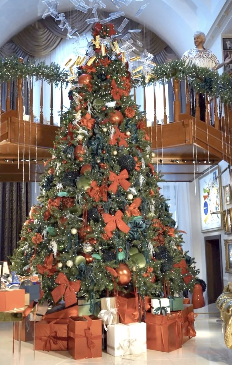 Можно заметить, что ёлка выполнена в эстетике Ralph Lauren. Здесь мы видим глубокие, насыщенные цвета, разность фактур, банты. Ёлка выглядит достаточно стильно и, по моему мнению, лучше, чем предыдущие ёлки знаменитости