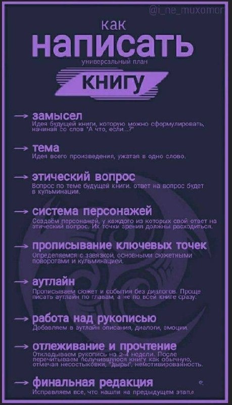 " Делюсь с вами тем самым алгоритмом, который мне позволил очень быстро написать книгу целиком! Основные ошибки, которые я совершала и из-за которых у меня не получалось дописать книгу: ❌ Не прописала тему и этический вопрос. Весь смысл книги - нести какой-то более глубокий смысл, чем просто повествование о каких-то действиях, читатель должен извлечь какую-то пользу. Я часто возвращалась при написании книги к этим двум пунктам, чтобы сверяться с верностью своего пути ❌ Не прописала систему персонажей. Я воспользовалась нейросетью, чтобы она написала мне список из 20 вопросов о каждом из персонажей, ответы на которые помогли бы точно сохранять смысл во всех поступках героев книги, и тогда у каждого из моих героев появилось ясно описанное прошлое и настоящее, характер и мотивация Зато я молодец и сразу прописала аутлайн еще в 2022 году, поэтому мне было легко на этом этапе, практически не редактировала его Хочу пожелать всем, кто хочет написать книгу, успеха и системного подхода, к