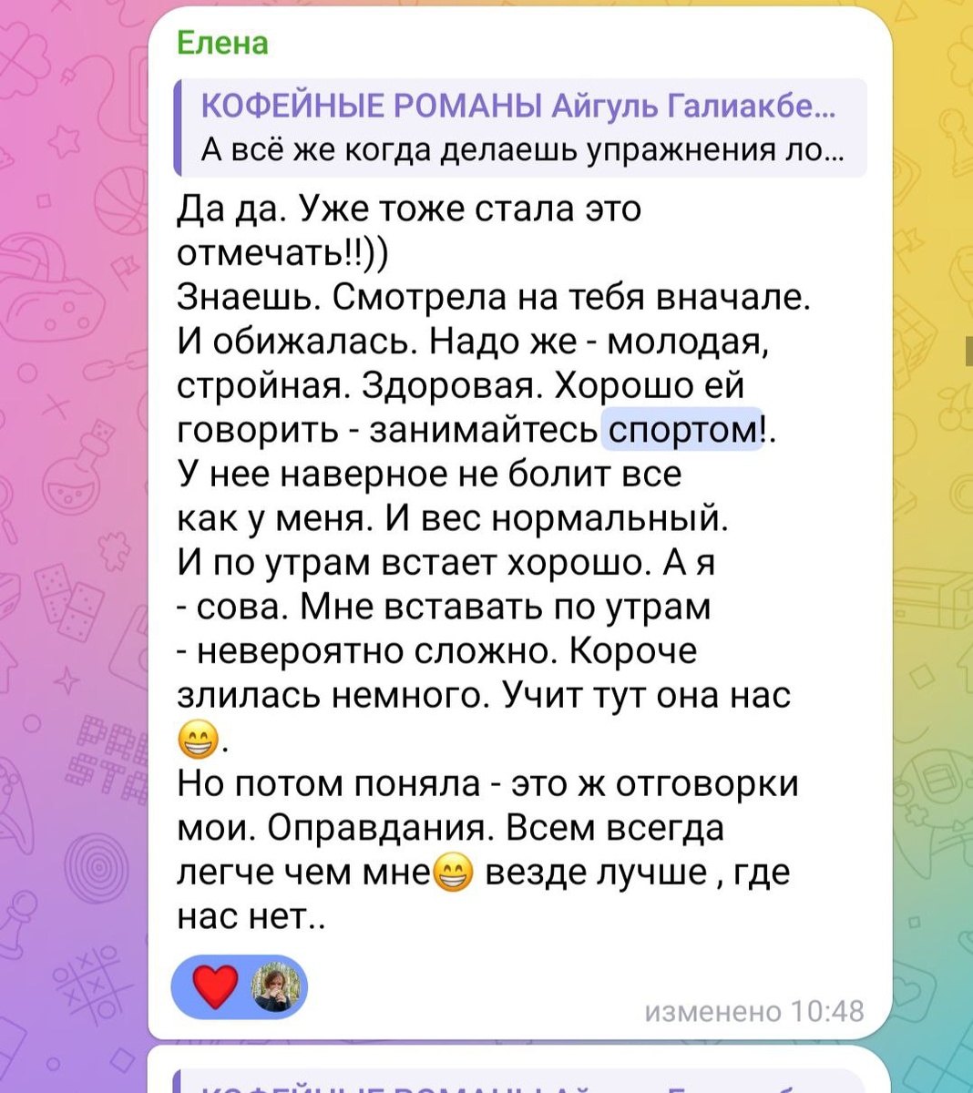 Для начала об основном: Я решила дописать-таки вторую часть "Путь ветра", поэтому прямо в ближайшее время рассказов не будет. Но потом будет многоглавный! Я начну выкладывать,когда будет написано 80-90%. Ну а теперь по теме 😁 Я знаю, что периодически перегибаю с публикациями про спорт. Уже все знают, что я на спорте, люблю Фитстарс и мой день начинается в 5 утра с тренировки и белкового завтрака. Знайте, тем кто смотрит мои статусы достаётся ещё больше 😁 Но, так же я уверена, что это всё не зря. Недавно читательница моего телеграм-канала (кстати, рекомендую подписаться, там тоже очень тёплая аудитория) призналась, что я слегка бесила её своими спортивными лозунгами. Но потом она поняла, что «её тело — её дело» и никто за неё тренировку не сделает. И не только начала регулярно делать зарядку, но и почувствовала результаты. Вот именно ради этого я пишу и буду писать про спорт! Может быть я ещё кого-то достану до такой степени, что он возьмёт и начнёт заниматься спортом. Ну хотя бы чу