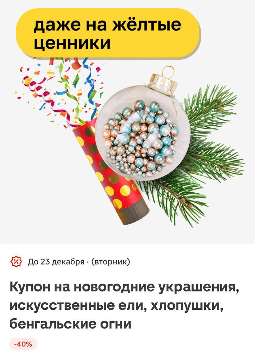🧲 Купон на скидку 🔺🔺🔺 Даже на желтые ценники до 23 декабря ‼️ на новогодние украшения, искусственные ели, хлопушки, бенгальские огни ПОКАЖИТЕ НА КАССЕ ✅ Канал по скидкам 🔣 Бот с промокодами