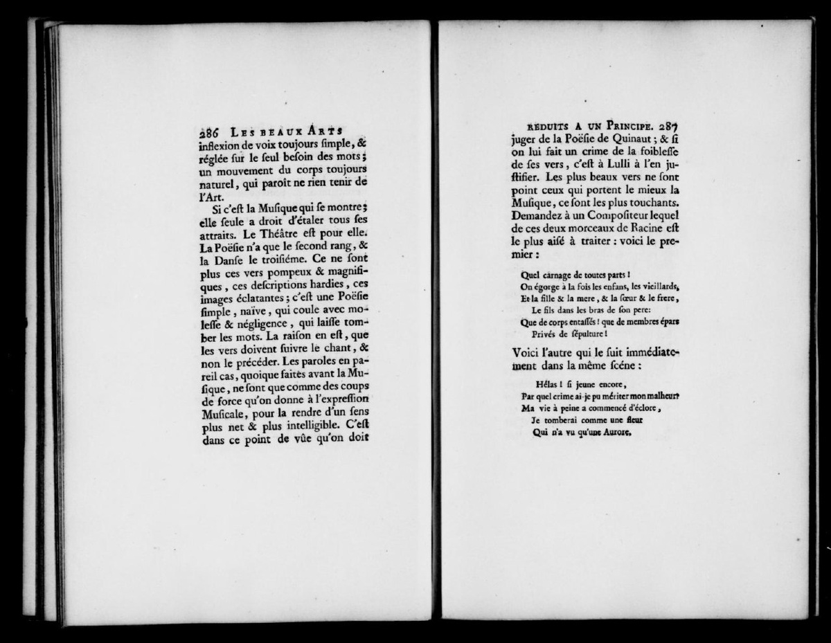 В трактате «Изящные искусства...» Шарль Батте пишет: один вид искусства должен главенствовать, остальные — лишь служить ему. В драме правит Поэзия. Музыка и Танец здесь вспомогательны. Сложная мелодия или выверенная жестикуляция недопустимы — они затмевают стихи. Нужны лишь простые интонации и естественные движения. В опере инициатива у Музыки. Поэзия отступает на второй план, становясь простой и мягкой, чтобы следовать за пением. Слова — лишь опора для экспрессии. Именно поэтому «слабые» стихи Кино идеальны для Люлли: композитору важна не сложность образов, а чувства, которые легко ложатся на ноты. Если же солирует Танец, Музыка ведет себя еще скромнее. Она не должна затмевать движение блеском, лишь точно аккомпанировать ему. Слух занимают ровно настолько, чтобы не мешать глазам. Ш. Батте, «Изящные искусства...», 1746 г.