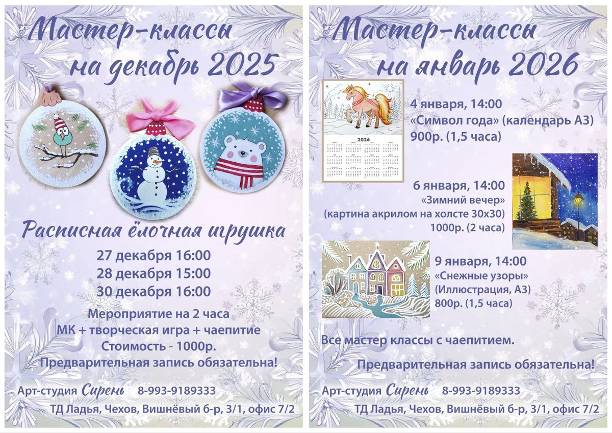 ✨ Арт-студия Сирень приглашает детей на увлекательные новогодние мастер-классы! 27 декабря 16:00 28 декабря 15:00 30 декабря 16:00 Роспись ёлочной игрушки🎄 4 января, 14:00 Символ года (изготавливаем свой календарь на 2026 год)🐴 6 января 14:00 Картина на холсте "зимний вечер"🌙✨ 9 января, 14:00 Иллюстрация "зимние узоры"❄️ Группа ВК: https://vk.ru/art_chekhov WhatsApp группа для записи: https://chat.whatsapp.com/LfKqHWywouq24P… т. 8-933-918-93-33 🏢 Арт-студия "Сирень" 📍 г. Чехов, Вишнёвый б-р, 3/1, оф 7/2 (ТЦ Ладья) 💰 Цена от: 800 до 1000 ₽ ⭐Поддержать канал голосом ✅ Мероприятия Чехов https://dzen.ru/id/66cc4b48e9ef144699238a51 http://vk.com/chekhov_events http://dzen.ru/chekhov_events