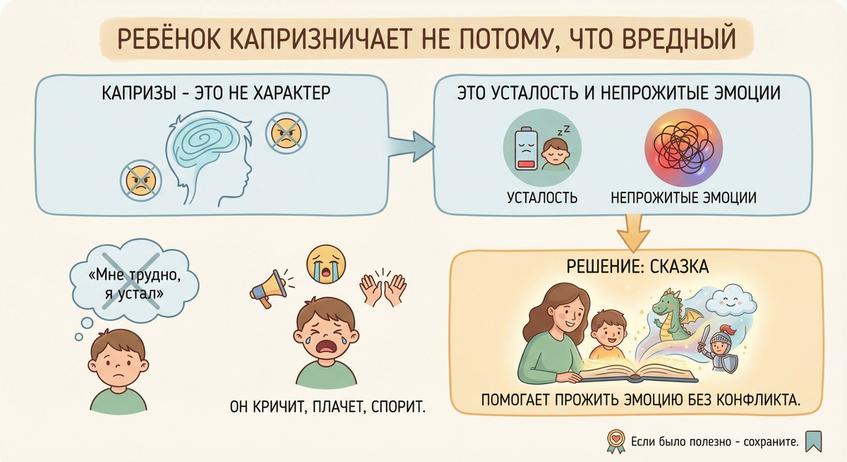 ” Капризы - это не характер. Это усталость и непрожитые эмоции. Ребёнок не умеет сказать: «Мне трудно, я устал». Он кричит, плачет, спорит. Решение: Сказка помогает прожить эмоцию без конфликта. Если было полезно - сохраните.