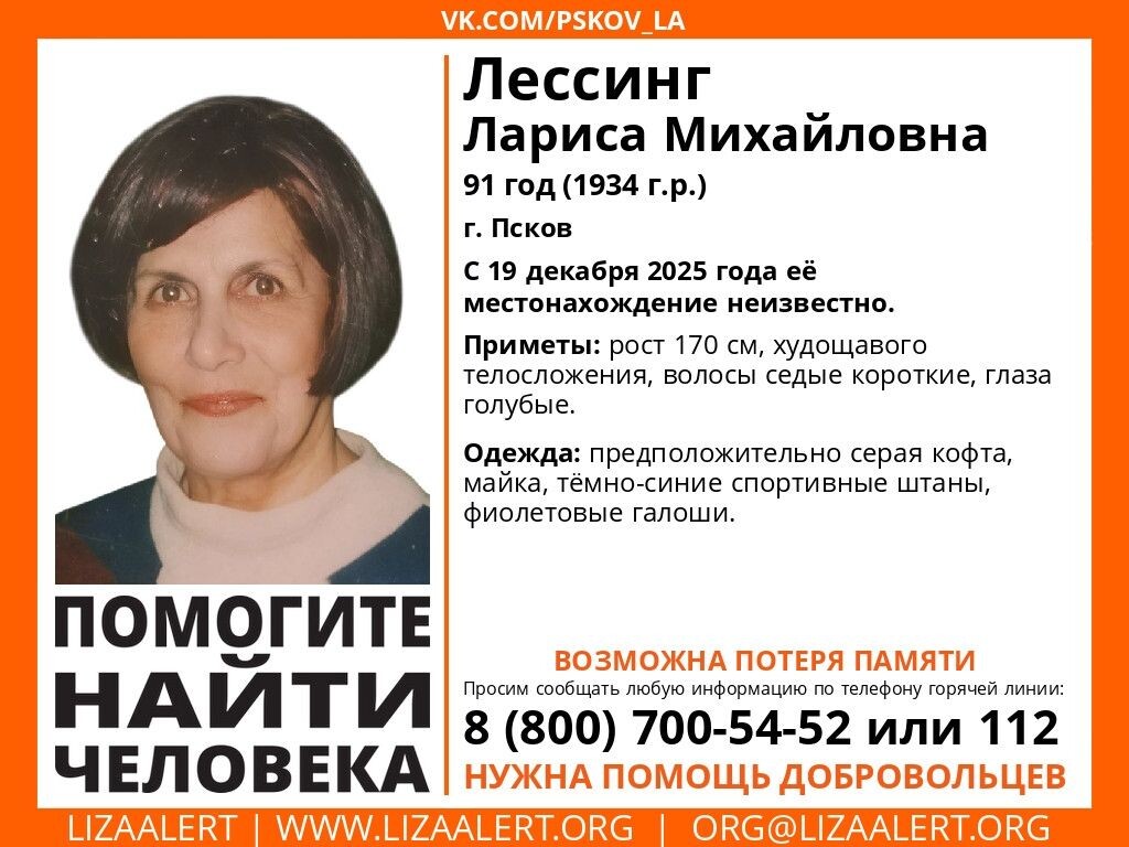 🚨 Поисковый отряд «ЛизаАлерт» Псковской области разыскивает пропавшую 91-летнюю Ларису Михайловну. ⚠️ Её местонахождение неизвестно с 19 декабря. 📞 Координаторы для связи: Анастасия (Подсолнух) +7 (911) 353-84-97, Никита (Плай) +7 (981) 351-21-50. 👉Подписывайтесь на ВЛуки.ру