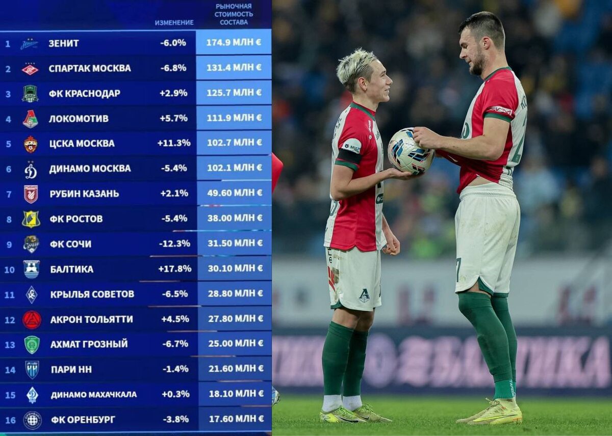 Очень интересно, Батраков тупо четверть всего состава в Локо сейчас 😀 Честно, давно не заглядывал на трансфермаркт по стоимости именно, но удивление, что Локо так высоко А какая пропасть после Динамо… просто в 2 раза. Балтика делает грязь конечно с таким составом, Талалаевич, респект. ➡️ Подписаться на ФутХайп
