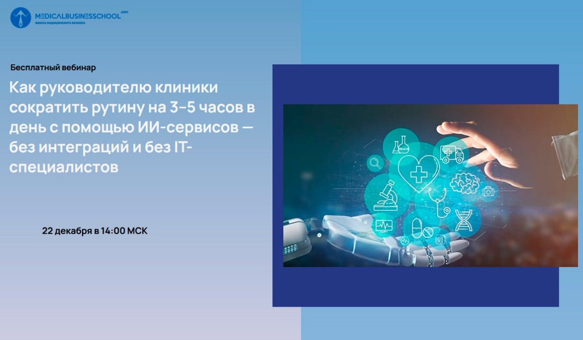 IT-специалистов – об этом будут говорить на бесплатном вебинаре, который проведет завтра Школа медицинского бизнеса. 💡На вебинаре вы узнаете, как с помощью ИИ за несколько минут: 🔹Создавать чёткие должностные инструкции и зоны ответственности для сотрудников. 🔹Оформлять регламенты и процессы клиники в удобной структуре и блок-схемах. 🔹Разрабатывать KPI и систему мотивации для отделений и контакт-центра. 🔹Собирать управленческие презентации за 3–5 минут. 🔹Анализировать данные и получать прогноз обращений. 👉 Подробнее >>> #медицина #бизнес #ai