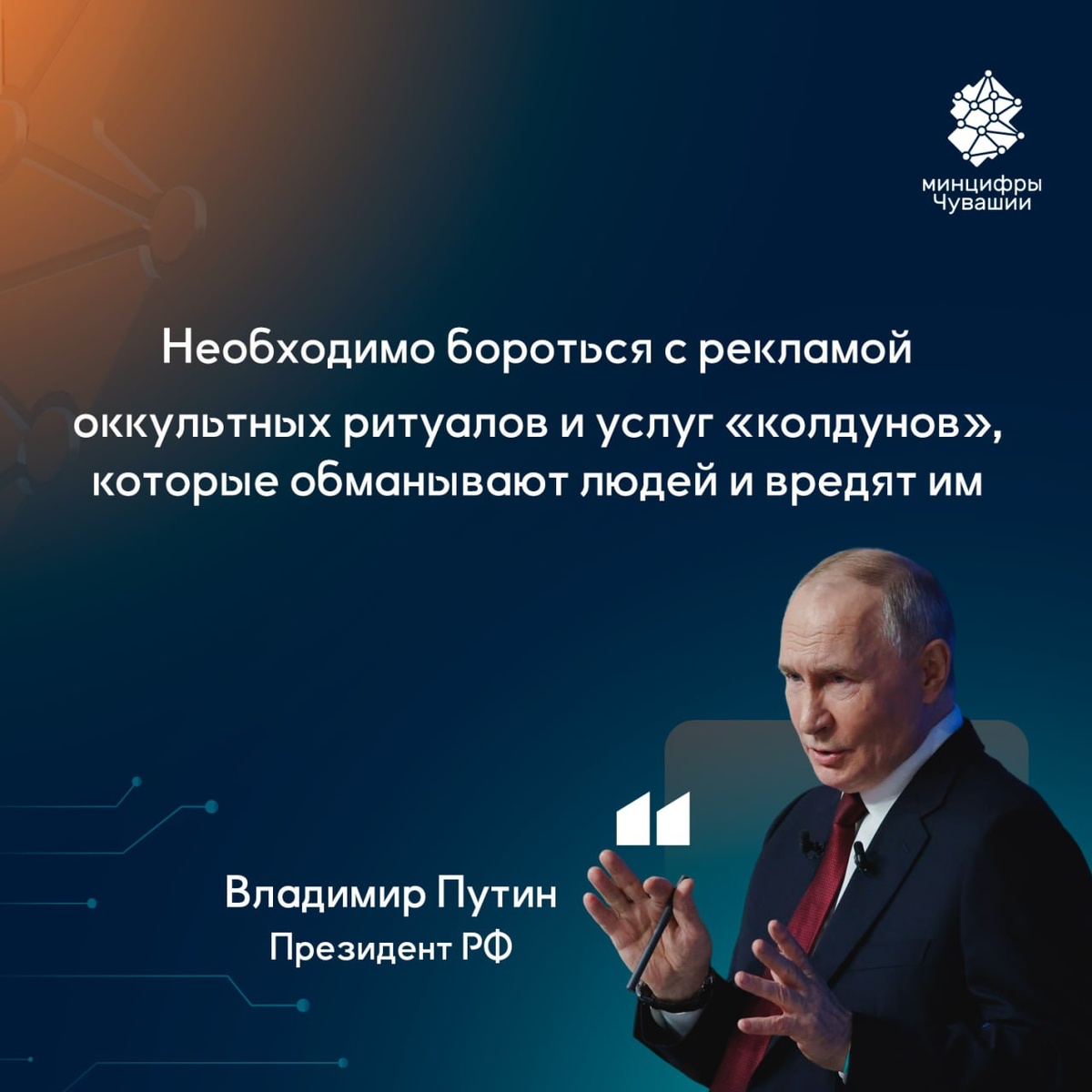 Вопрос о противодействии сатанизму* и эзотерике задала журналистка православного телеканала «Спас». Сатанизм, оккультные услуги, всякие колдуны и так далее — бред просто, вводят людей в заблуждение, загоняют их в какой-то тёмный угол в прямом и переносном смысле этого слова. Наносят существенный ущерб гражданам, их моральному состоянию, да и психическому, — сказал Президент. * «Международное движение сатанизма» признано экстремистским и запрещено в России #МинцифрыЧувашии ЦИФРОВЫЕ НОВОСТИ ЧУВАШИИ Подписывайся на нас в МАХ Подписывайся на нас в ВК
