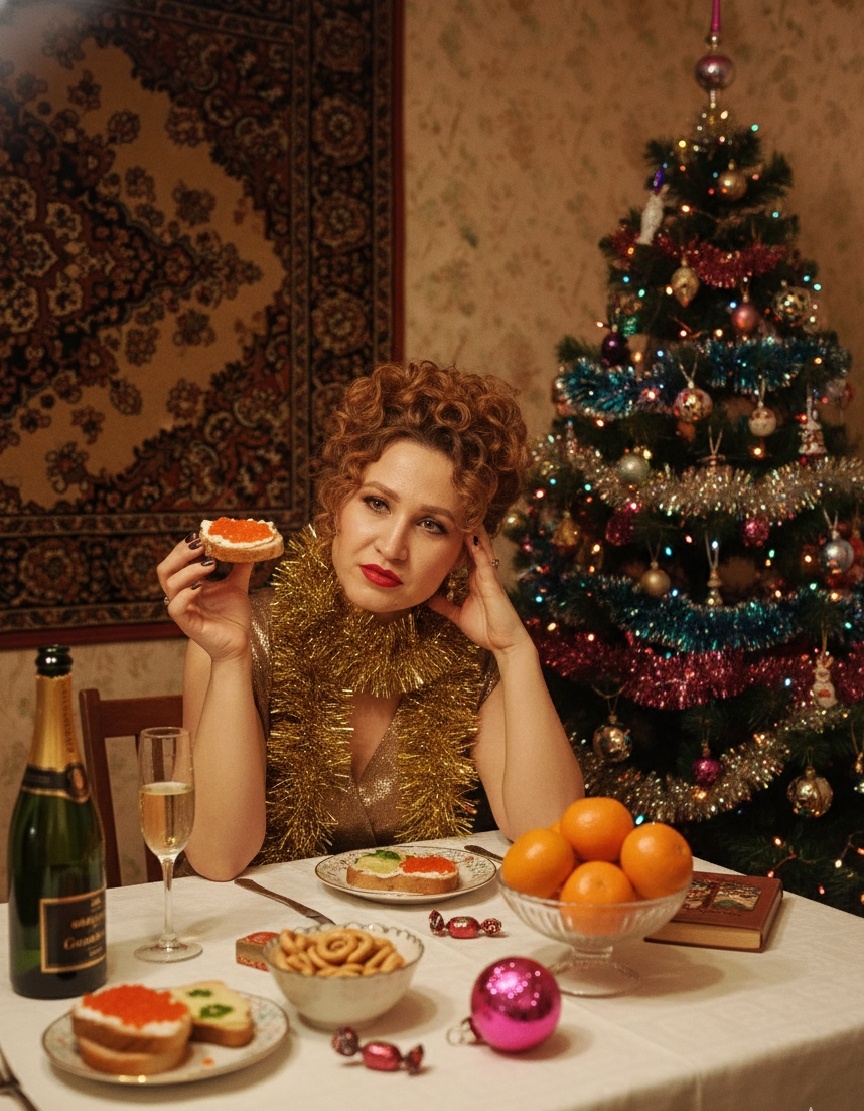 Создай реалистичное фото, не меняя мою внешность и черты лица. Винтажная новогодняя сцена (вертикально 2:3), тёплая кинематографичная палитра, 35mm плёночный вид с зерном. Центральная фигура за праздничным столом: верх тела, кудрявые волосы в высокой 90-х причёске, красная помада, золотисто-бронзовая блестящая блуза, золотая мишура на шее. Одна рука держит бутерброд с красной начинкой,