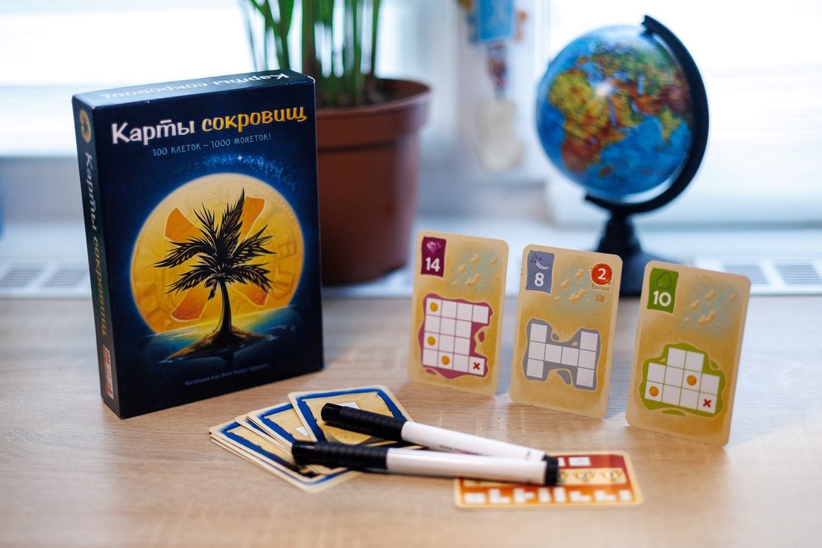 Когда закупался на ДР клуба, взял игрушку на сдачу. Особых надежд не питал, но этот небольшой рисовач в маленькой коробке, неожиданно ставший хитом нашего отпуска. В игре мы будем изучать карты сокровищ и зарисовывать небольшими полиминошными фигурами. На 4 раунда игры выходит 21 фигура. Ваша задача — закрывать карты максимально эффективно, потому что если не можете уместить какую-то фигуру, то зачеркиваете один любой квадратик, вместо 2-4. На каждой карте есть обычные ПО + бонусы за цвет карточки, стоит собрать парочку таких и вы уже охотитесь за ними на рынке. Присущи почти все играм в этом жанре. Как я и сказал, игра стала хитом нашего отпуска. В основном её лоббировали Даник и Саша. Я же в какой-то момент словил себя на мысли, что устал от неё, потому что за 7 дней мы наиграли партий 30. Тем не менее игра хорошая, приятные семечки на 20 минут, которые интересно играть в разномастной компании Своих денег однозначно стоит. Спасибо, что читали. Если вам нравятся игры в жаре пиши-рисуй