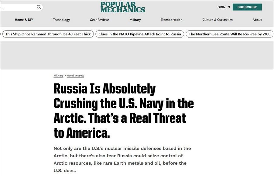 "Россия наносит сокрушительный удар по ВМС США в Арктике. Это реальная угроза для Америки". Под таким заголовком размещена статья в достаточно серьёзном международном журнале - "Рopular mechanics". Содержит новости науки и техники: новые технологии, наука, оружие, авиация, космос, автомобили. А заодно промывает мозги читателям статьями вот под такими заголовками.